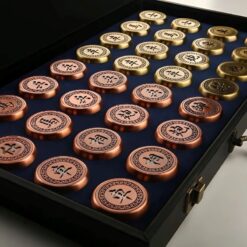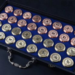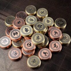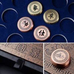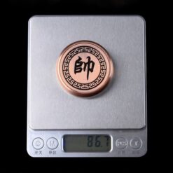 - Thiết kế tinh xảo: Quân cờ có đường kính 5 cm và độ dày 1,5 cm, chạm khắc chi tiết với họa tiết sắc sảo. Sự kết hợp giữa đồng đỏ và đồng vàng mang đến vẻ đẹp hài hòa, sang trọng.