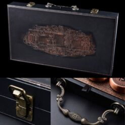 - Hộp đựng sang trọng: Hộp đựng cờ được làm từ da cao cấp, kích thước 49 cm x 28 cm, vừa bảo quản tốt các quân cờ vừa thể hiện sự sang trọng. Họa tiết trang trí trên hộp cũng được chạm khắc tinh xảo, tôn lên giá trị của sản phẩm.
