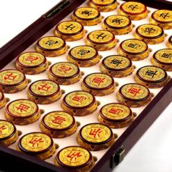 • Quân cờ: Quân cờ được chế tác từ hồng mộc mạ vàng thật, với các chi tiết chạm khắc rồng uốn lượn tinh xảo. Ánh vàng rực rỡ của quân cờ không chỉ thể hiện sự sang trọng mà còn mang lại cảm giác thịnh vượng cho người chơi.