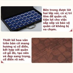 • Hộp cờ sang trọng: Hộp cờ được làm từ chất liệu da cao cấp, bên trong lót hai lớp vải nhung mềm mại, giúp bảo vệ các quân cờ khỏi va chạm và trầy xước. Các vị trí lỗ lõm trong hộp được thiết kế tỉ mỉ, giúp sắp xếp quân cờ một cách tiện lợi và ngăn nắp. Hoa văn chạm khắc tinh xảo trên mặt ngoài của hộp cờ, mang đậm phong cách cổ điển, gợi nhớ đến những giá trị văn hóa truyền thống.