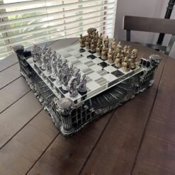 Bàn cờ được làm từ kính cao cấp, kết hợp cùng nền móng mô phỏng đấu trường La Mã cổ đại, tạo nên một không gian chơi cờ đầy huyền bí và lôi cuốn. Các cột trụ và đấu trường xung quanh bàn cờ đều được thiết kế với độ chi tiết cao, tái hiện lại sự hùng vĩ và bề thế của kiến trúc La Mã cổ đại. Sự kết hợp giữa chất liệu kính và composite tạo nên một tổng thể hài hòa, vừa hiện đại, vừa cổ điển.